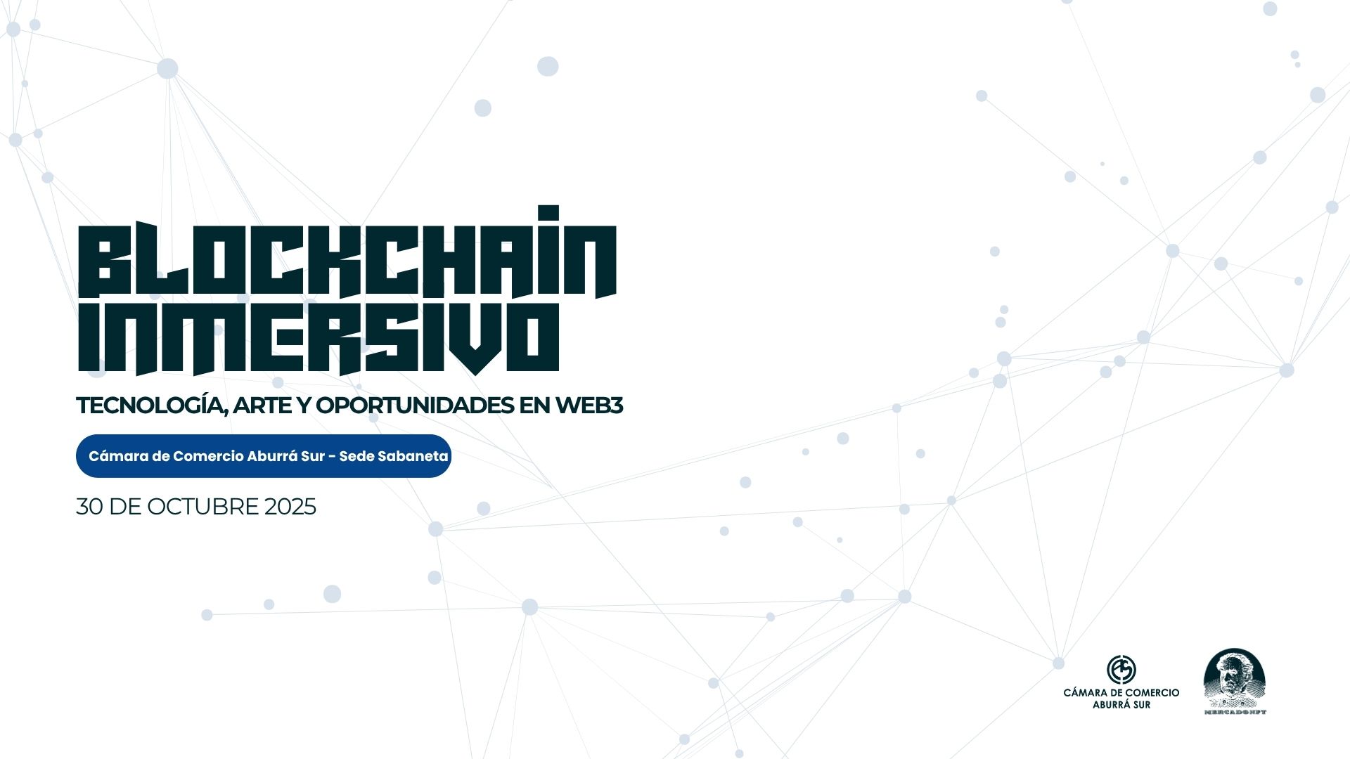 El 30 de octubre de 2025 se realizará Blockchain Inmersivo un encuentro para aprender, conectar y sobre todo estar conectado con arte y la tecnología. En La Cámara de Comercio de Aburrá Sur – Sede Sabaneta, ubicado cerca al parque principal de Sabaneta Antioquia, con el ánimo de atraer público principiante y conocedores para mostrar varias experiencias relacionadas con el mundo cripto, tanto en lo artístico, económico y social. Todo en función de generar conocimiento-adopción-difusión de los activos digitales únicos relacionados con el arte digital; además de dar a conocer a diversos criptoartistas y su talento.